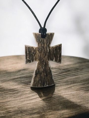 This rustic cross pendant is hand-carved from naturally shed deer antler, showcasing the raw texture and rich, earthy tones of the outer bark. The flared-armed design gives it a timeless, grounded feel, while the smooth back ensures comfortable wear. Suspended on a black leather cord, it’s a powerful symbol of faith and nature, perfect for those who appreciate meaningful craftsmanship rooted in the wild.