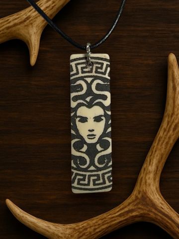Inspired by ancient mythology and rendered on ethically sourced bone, the design is bold, mysterious, and richly detailed. Paired with a twisted sterling silver link adding a subtle artisan touch, suspended on a smooth leather cord. A striking piece for those who embrace the power and allure of mythic symbolism.