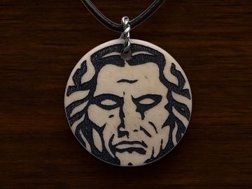 Engraved on ethically sourced bone, the design captures a sense of symmetry, balance, and timeless artistry. A twisted sterling silver link adds a refined, tactile element, while the black leather cord gives it a clean, modern finish. A powerful piece for those who appreciate classical art reimagined in natural materials.