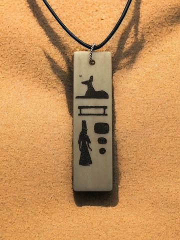 This pendant features a vertical arrangement of ancient Egyptian hieroglyphs, laser-engraved with precision into ethically sourced bone.